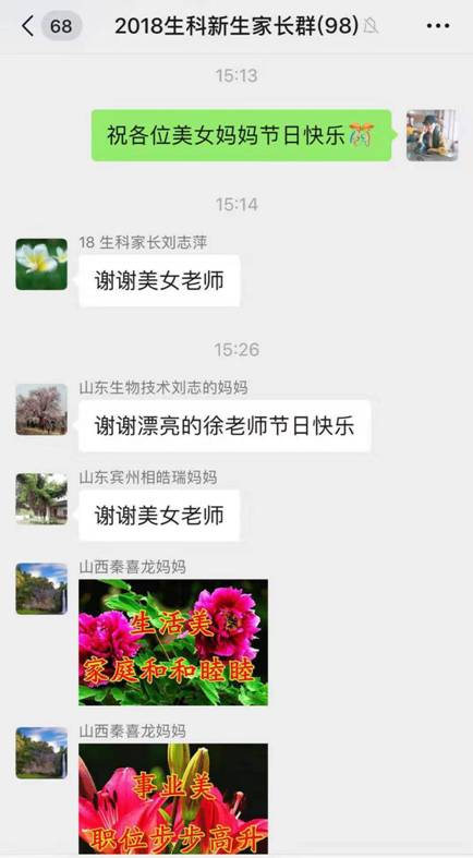 当日,学生们给全院女教师录制了祝福视频,向老师们致以节日问候;每一个画面、每一句话都表达了学生对老师们的深切感情。辅导员也在家长群里送去节日祝福,同时号召同学们给自己母亲打通祝福电话,发条关心消息,表达对母亲的感恩之情。
