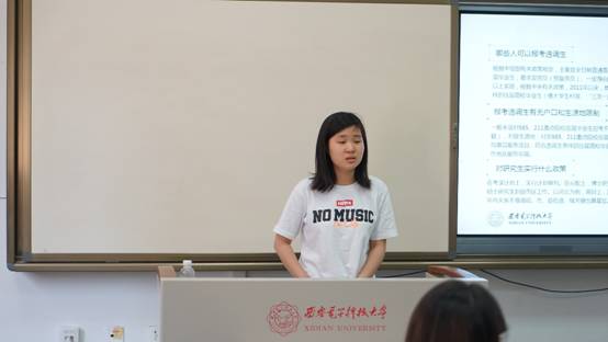 交流会伊始,肖华作为考取公务员就业毕业生代表,围绕选调生报考条件、招录大纲及招录流程三方面,分享了个人在报考中遇到的各种问题和宝贵经验,并通过引入部分选调生笔试及面试考题,让同学们有了更加直观地了解与感受。