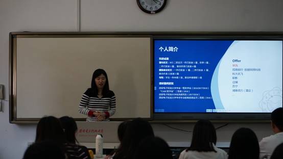 接着,刘丽作为从事技术研发工作的就业学生代表,详细介绍了预期工作定位、招聘信息获取、个人简历制作、笔试面试考核以及最终签约单位五个方面内容,分享了自己在企业就业方向的心路历程。同时,她也提醒大家要在加强专业学习的同时,要积极锻炼人际沟通能力,为自己的未来工作打下良好的沟通能力基础。