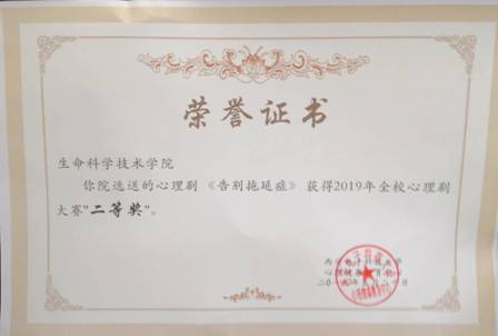 学院实践部精心组织编排的“告别拖延症”心理健康情景剧,获得2019年全校心理剧大赛“二等奖”。