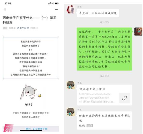 加强学生线上自主学习引导,助力线上教学有序开展。为引导学生形成良好的学习习惯,充分利用好超长假期的时间,学院制作了一期微信推送,专门介绍了一些学习资源和学习方法,得到学生的良好反馈。学校决定启动线上教学后,辅导员全程参与到线上教学的测试和反馈中,协助老师们建立相应的微信、QQ、钉钉群,及时解决学生在线学习中存在的困难,做好选课、补考预约等事项。同时,辅导员开展了线上晚点名,就学生关心的各项事宜给与全面解答,并对新形势下的“空中双选会”等就业服务情况做了全面介绍。