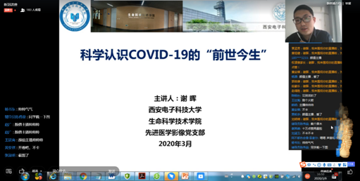 讲座中,谢晖老师分别对新冠病毒的基础知识、发现和判断、来源、传播、防控以及可能面临的挑战进行阐述。讲座中,他着重提到了面对新冠病毒采用AI影像判断的方式对新冠病毒的筛查和疫情监测系统、新冠病毒自学习模拟器以及生命大数据分析对新冠防控的巨大帮助。进而说明生命科学、生物信息、医学治疗、电子信息、医学仪器、人工智能、大数据、软件编程多方面结合,构建医工交叉学科对社会、未来的积极作用。