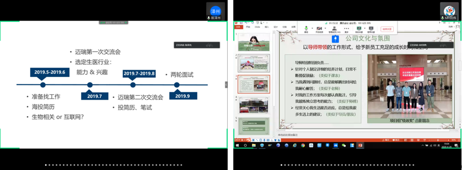 紧接着,365英国官网两位进入迈瑞医疗的毕业生结合自身经历为同学们做了精彩的就业分享。2020届毕业生陈泽洲分享了他两轮面试的经验和体会,2019届毕业生许晴向同学们介绍了作为职场新人,如何尽快的融入公司的文化与氛围,如何更快的成长。