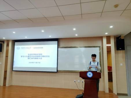 接下来由获奖本科生代表郑佳慧和研究生代表年颖玉做了学习心得分享。郑佳慧谈到,在刚刚过去的十九届五中全会中,习近平总书记指出“十四五”时期是我国全面建成小康社会、实现第一个百年奋斗目标后,乘势而上开启全面建设社会主义现代化国家新征程、向第二个百年奋斗目标进军的第一个五年,是我国社会主义现代化建设承前启后、继往开来的新的历史坐标。我们作为大学生学习十九届五中全会精神,可以为积极参与祖国建设做好职业规划,在学习和生活中做好落实,只有紧跟时代大局才能更好的为人民服务。