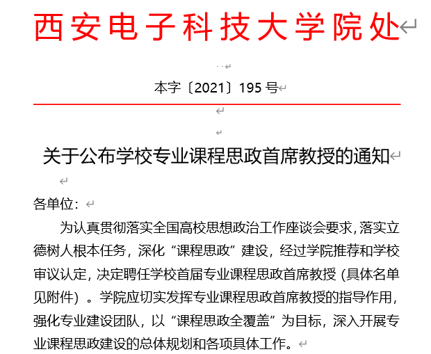 2021年11月18日,学校召开第四届本科教育教学节——课程思政推进会,党委书记查显友,党委副书记、副校长任小龙,副校长王泉参加会议。会议由本科生院常务副院长苏涛和陕西省课程思政教学研究示范中心学术委员会主任李刚主持。会上,校领导为学校首届专业课程思政首席教授颁发聘书。