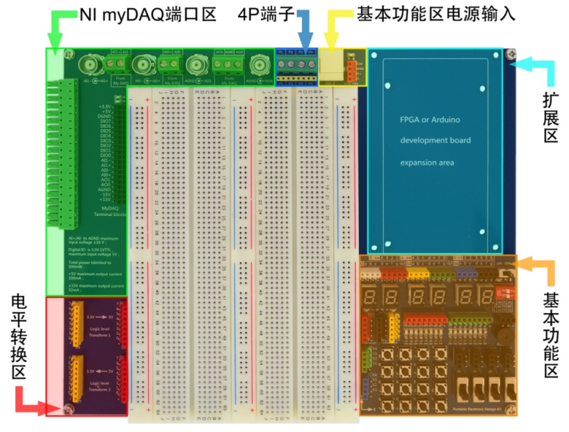 较往年而言,今年的《生物医学工程综合实验》课程最大的改变是使用了myDAQ实验盒。往年的实验,学生通过内置采集电路Pclab800实验箱完成固定端口的连接即可进行信号测量,排查错误灵活性小,学生获得感不高。在学院的大力支持下,今年实验室引进了美国国家仪器有限公司(National Instruments)推出的myDAQ实验盒,使得学生可以从零开始搭建生物医学信号的采集、调理等电路,亲自动手完成信号处理和展示等全部过程。myDAQ实验盒集成了包括示波器、函数发生器和波特分析仪等8个电子测试虚拟仪器,并配置了2块680孔面包板、2路模拟输入和2路模拟输出等资源,可直接与LabVIEW、Multisim无缝搭配使用。