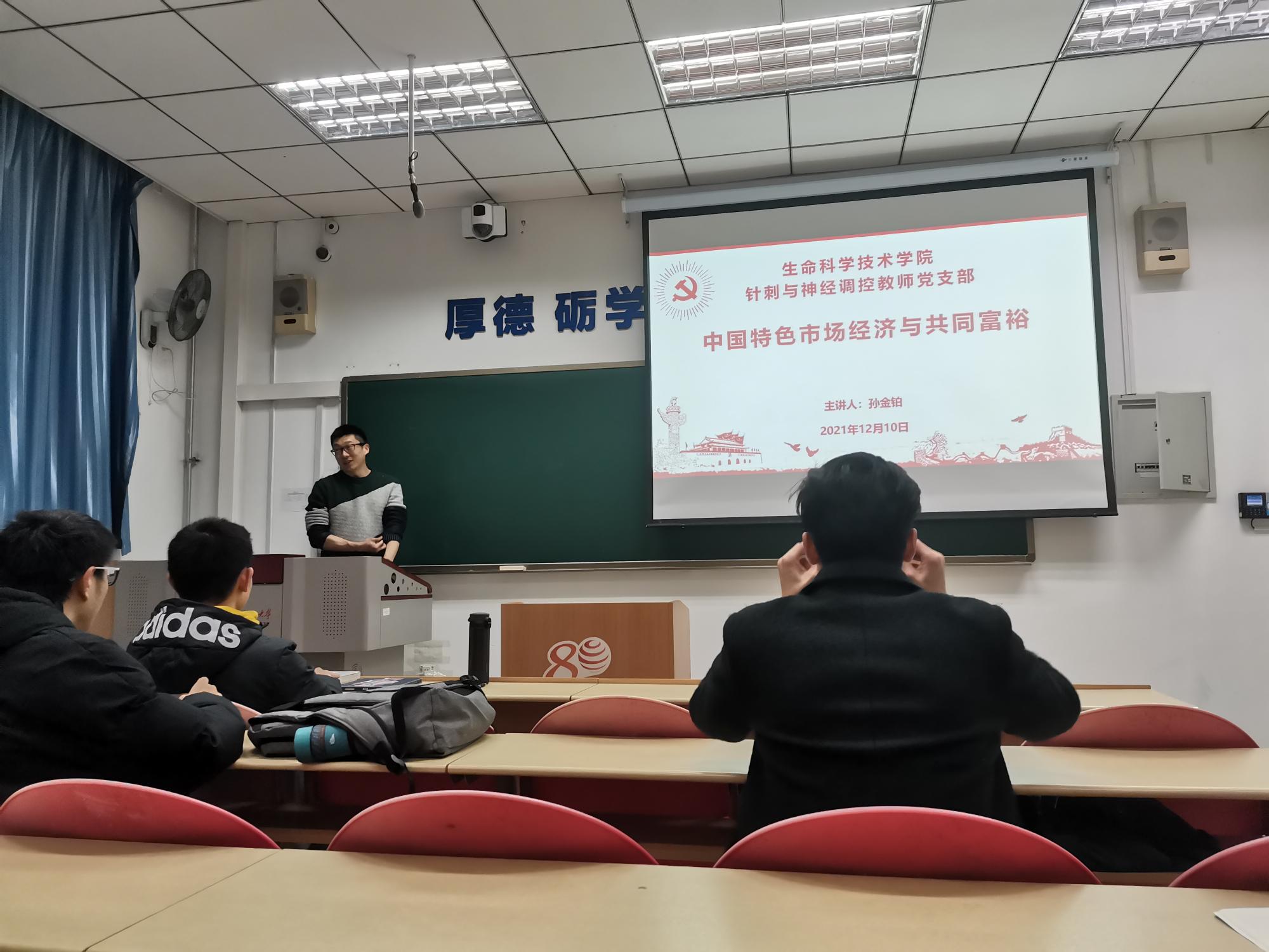 为加强对习近平新时代中国特色社会主义经济思想的理解,2021年12月10日下午,孙金铂老师于信远楼I区106教室,为365英国上市官方网站大二部分学生和针刺与神经调控研究生党支部全体党员与积极分子上了一堂题为“中国特色市场经济与共同富裕”的党课。