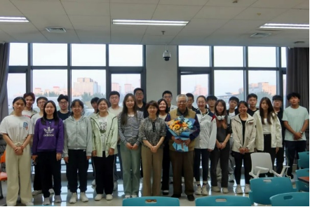 最后,吕才教授以三首校歌为讲座画上圆满句号,师生们在激昂铿锵的旋律中,深切感受北外的光辉岁月。恰逢九月初九重阳节,徐安君同学代表全体新生为吕才教授送上花束,表达最诚挚的感谢和美好的祝愿。讲座结束后,全体人员合影留念。