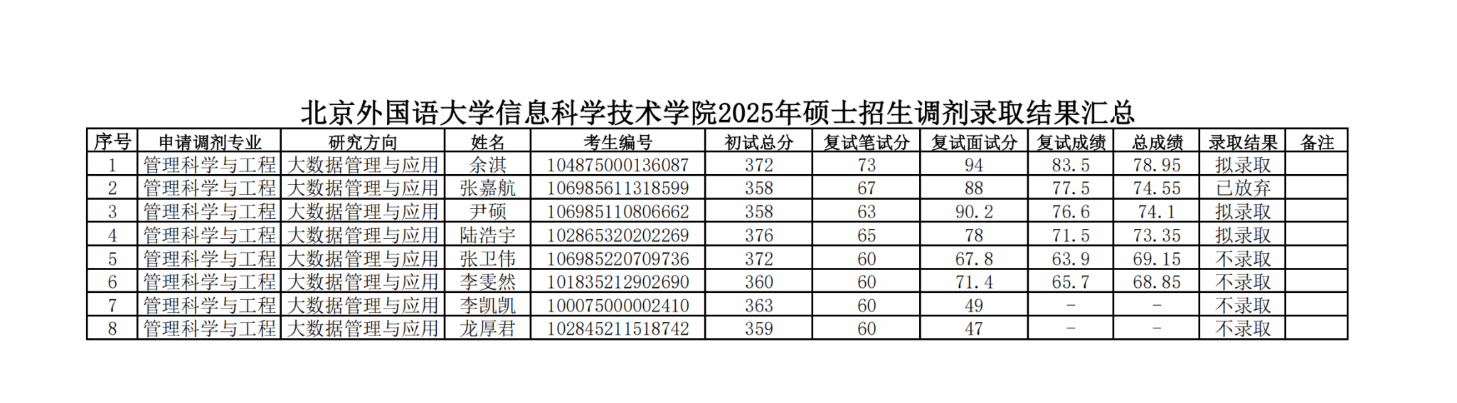 beat365唯一官网2025年硕士招生调剂复试拟录取结果