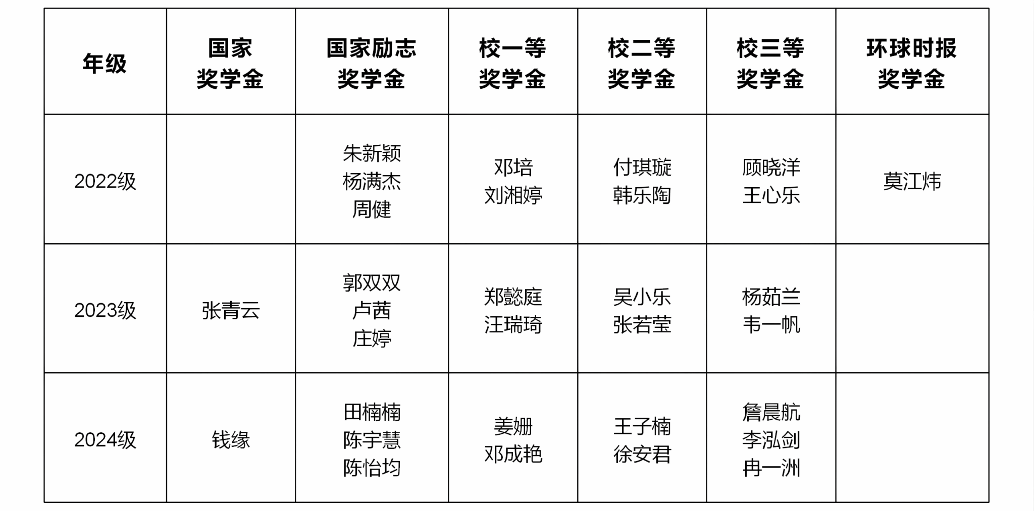根据《北京外国语大学学生手册》(2024年版)中《北京外国语大学学生资助工作管理规定》及各类奖、助学金相关规章条款,结合学院各年级综评排名情况和学业成绩,经学生个人申报、班级推荐审核、学院评奖评优工作领导小组审定,学院2024—2025年度本科生国家奖学金、国家励志奖学金、校级奖学金、社会捐赠奖学金评审结果如下(排名不分先后):